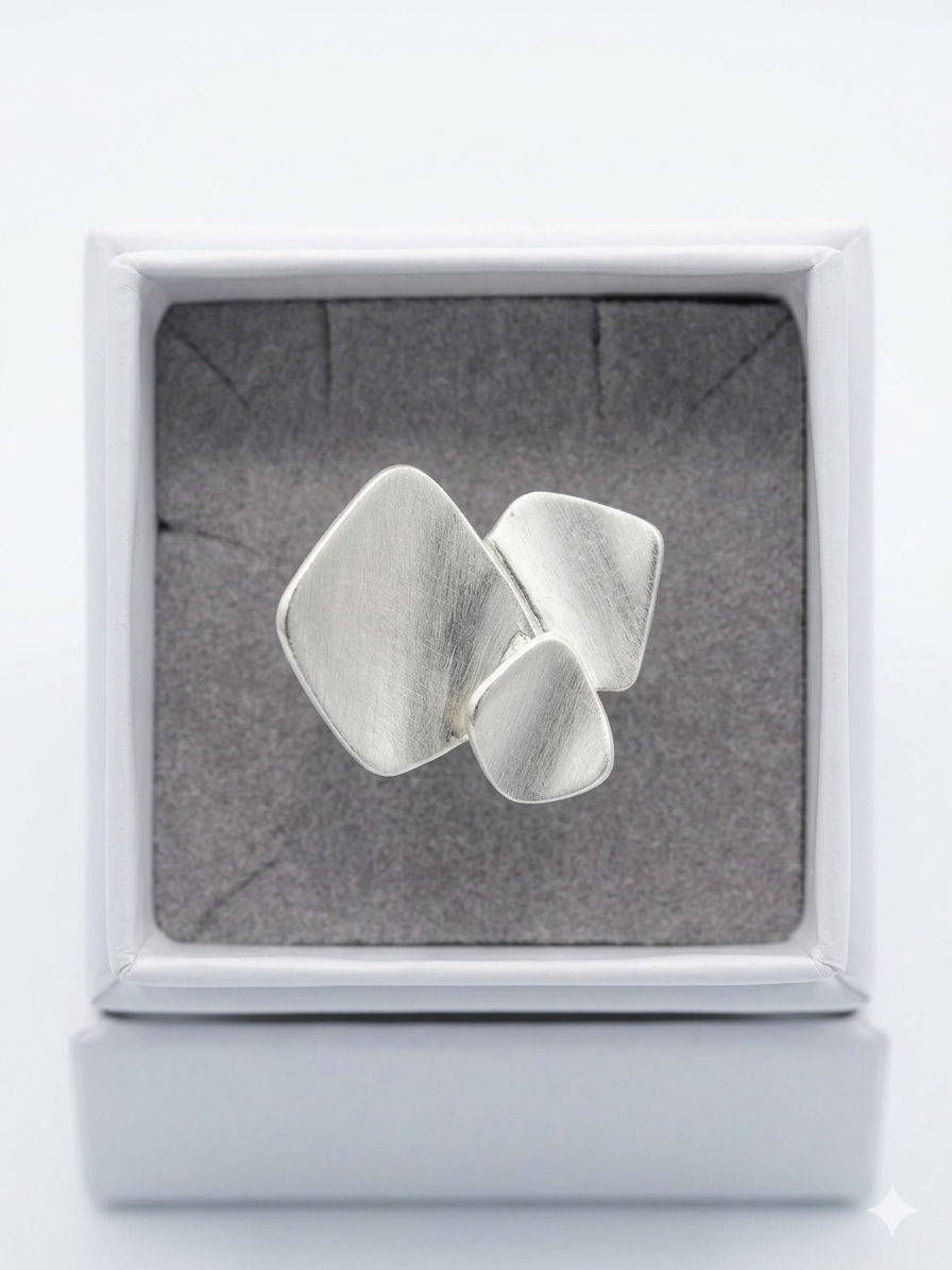 Il design frontale è composto da un mosaico astratto di tre elementi quadrangolari dalle forme morbide e irregolari, sovrapposti con sapienza per creare un effetto tridimensionale. Ogni elemento è impreziosito da una pregiata finitura satinata che dona al metallo un aspetto setoso e opaco, riflettendo la luce in modo discreto e profondo. La struttura a fascia alta assicura una presenza importante sul dito, pur mantenendo una linea pulita e minimalista.
