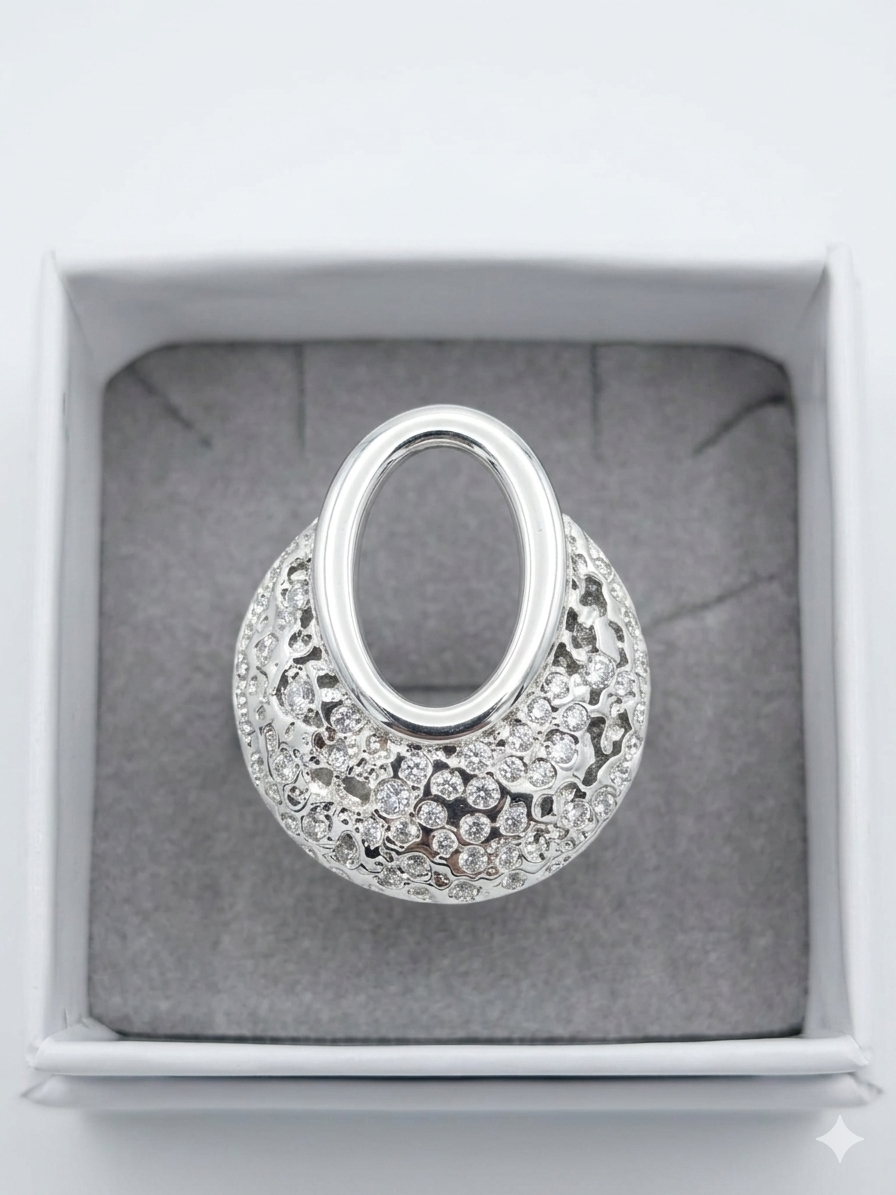 Il corpo dell’anello presenta una struttura scultorea caratterizzata da un’ampia fascia traforata con motivi organici, che richiamano la preziosità di un nido d’ape. La superficie è interamente impreziosita da un ricchissimo pavé di cristalli luminosi di diverse dimensioni, incastonati a mano per creare una brillantezza multidimensionale. Al centro, un’elegante cornice ovale a specchio definisce il design, donando un tocco di ordine geometrico a questa cascata di luce.