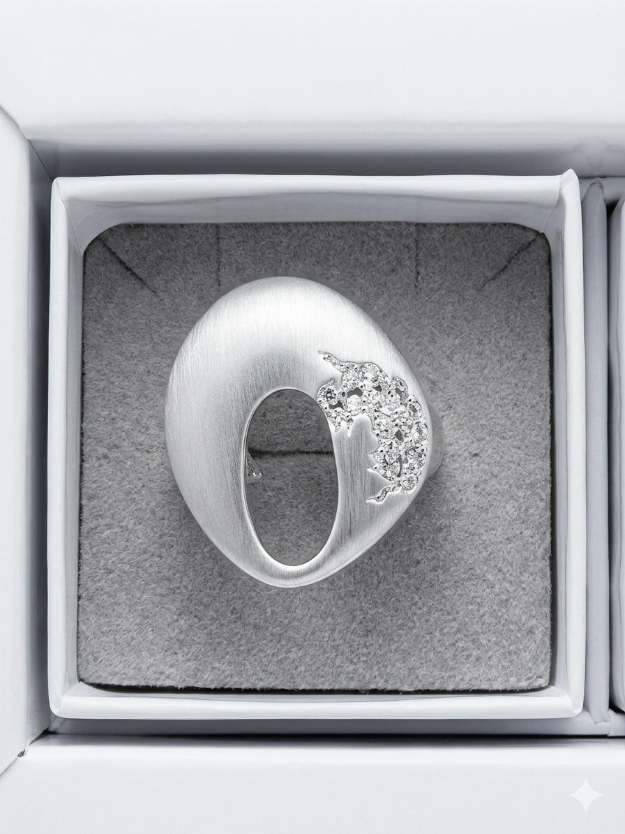 Grazie alla sua estetica scultorea e pulita, questo anello è perfetto come pezzo unico per dare carattere a un outfit minimalista o per completare un look da sera con un tocco di luce originale. Viene consegnato nella sua elegante confezione originale, come mostrato nello scatto da studio, rendendolo un’idea regalo sofisticata.