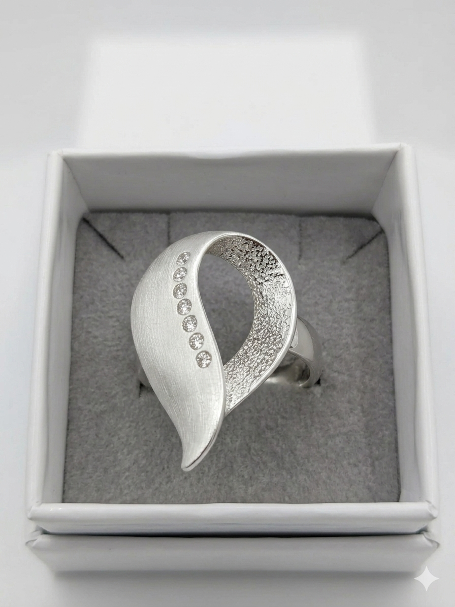 L’anello presenta un’affascinante alternanza di lavorazioni artigianali: la superficie esterna è caratterizzata da una finitura satinata setosa, mentre l’interno rivela una texture martellata pensata per riflettere la luce in modo vibrante e profondo. Lungo una delle volute frontali è incastonato un raffinato pavé asimmetrico di cristalli luminosi, che aggiunge un punto luce prezioso e dinamico all’intera composizione.