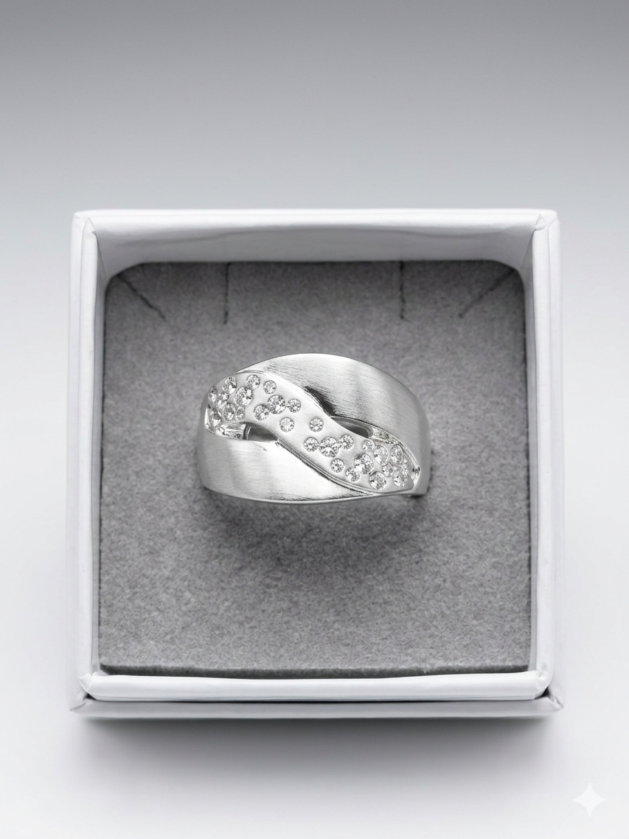 Il corpo dell’anello presenta una superficie ampia e morbidamente curvata, impreziosita da una pregiata finitura satinata che conferisce al metallo un aspetto setoso e una lucentezza soffusa. Al centro, una sinuosa incisione a onda attraversa l’intera fascia, ospitando un fitto pavé di cristalli luminosi incastonati a mano. Il contrasto tra la base opaca e il luccichio vibrante dei cristalli crea un gioco di riflessi magnetico che segue ogni movimento della mano.