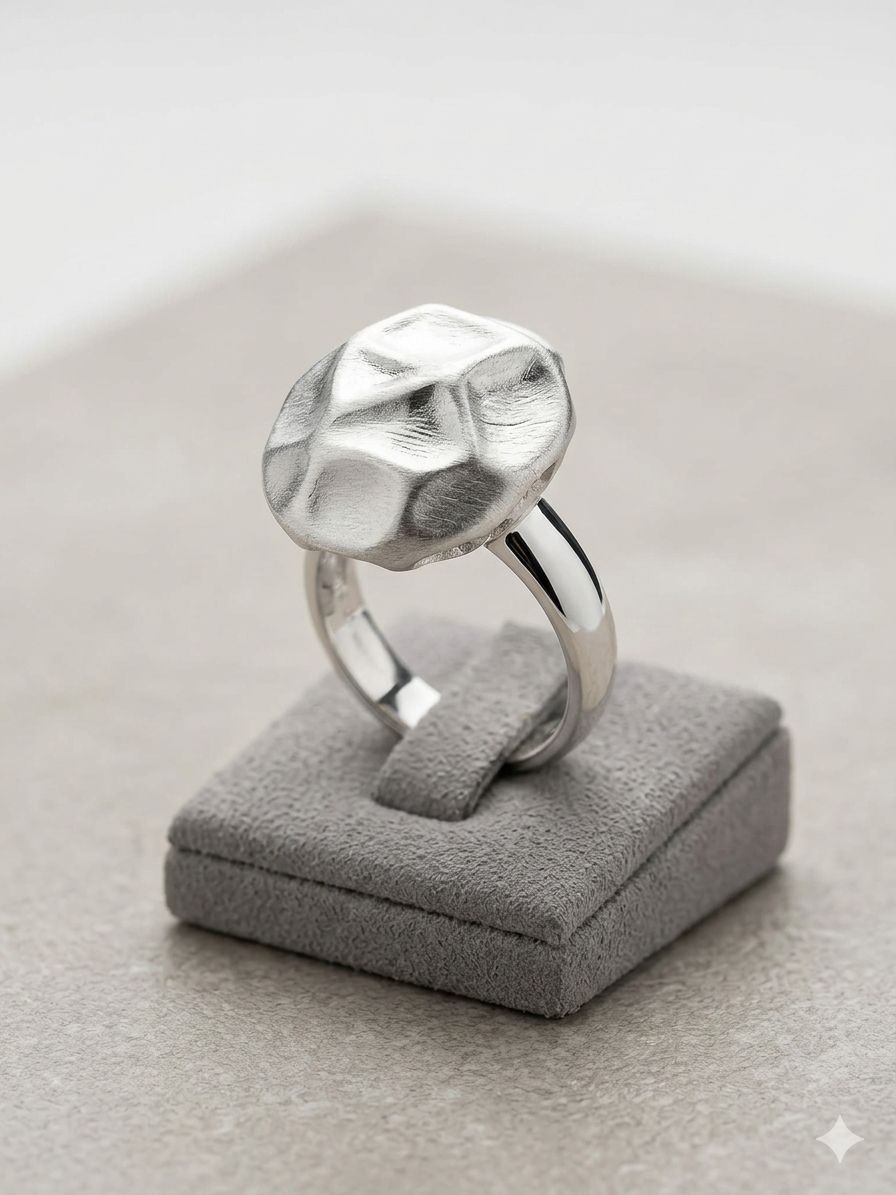 Il protagonista assoluto è il grande elemento centrale dalla forma circolare e bombata, caratterizzato da una profonda lavorazione martellata e una finitura satinata che ricorda le superfici lunari. Questa texture irregolare crea un gioco di ombre e luci soffuse, donando al gioiello un aspetto materico e sofisticato. La struttura elastica a maglie lisce non solo garantisce una lucentezza a specchio in contrasto con il top opaco, ma offre anche una vestibilità perfetta e confortevole su ogni misura di dito.