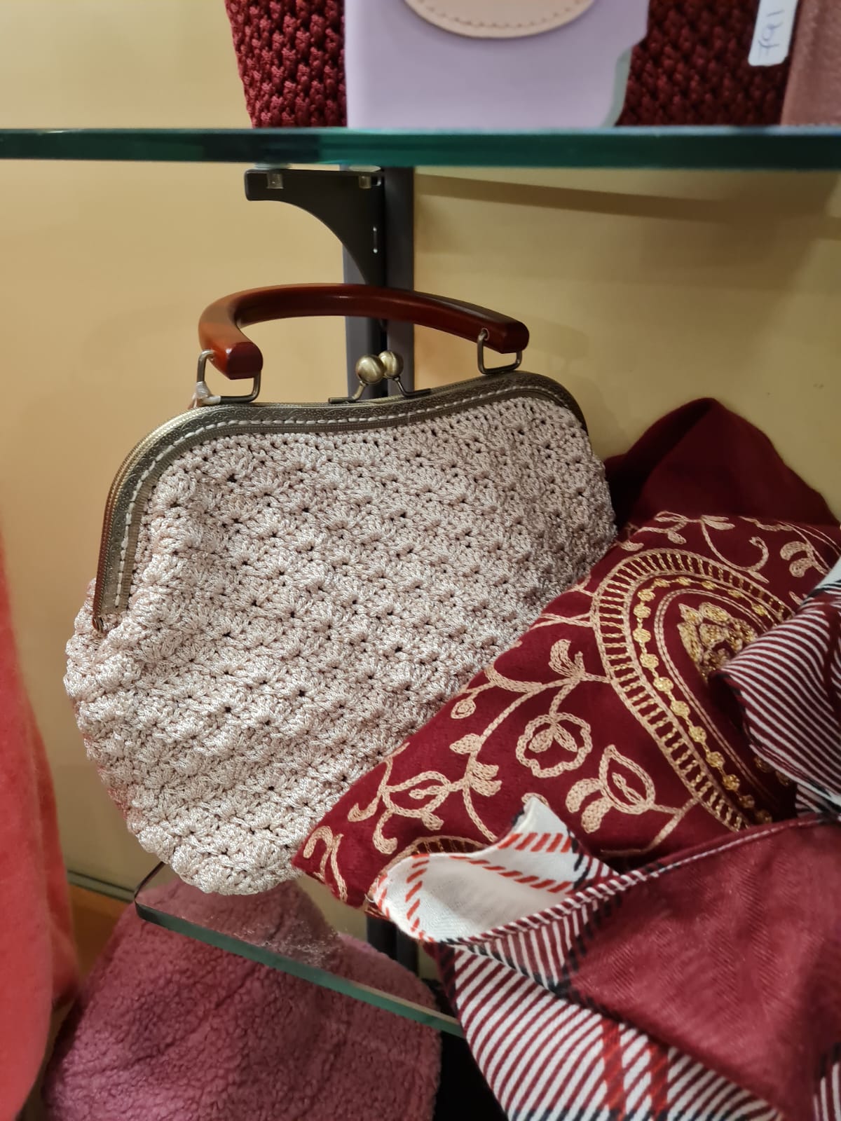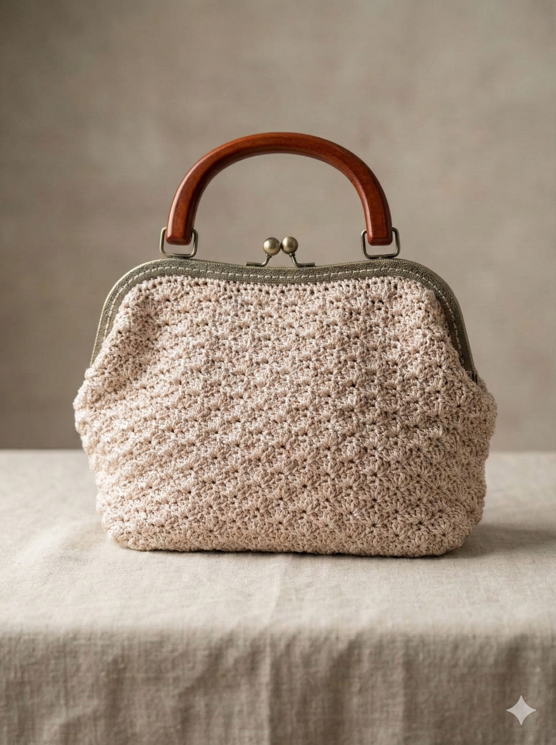 Lavorazione Delicata: Realizzata con una morbida lavorazione all’uncinetto (crochet) in una versatile tonalità di beige chiaro o rosa cipria, che aggiunge una texture raffinata e romantica.