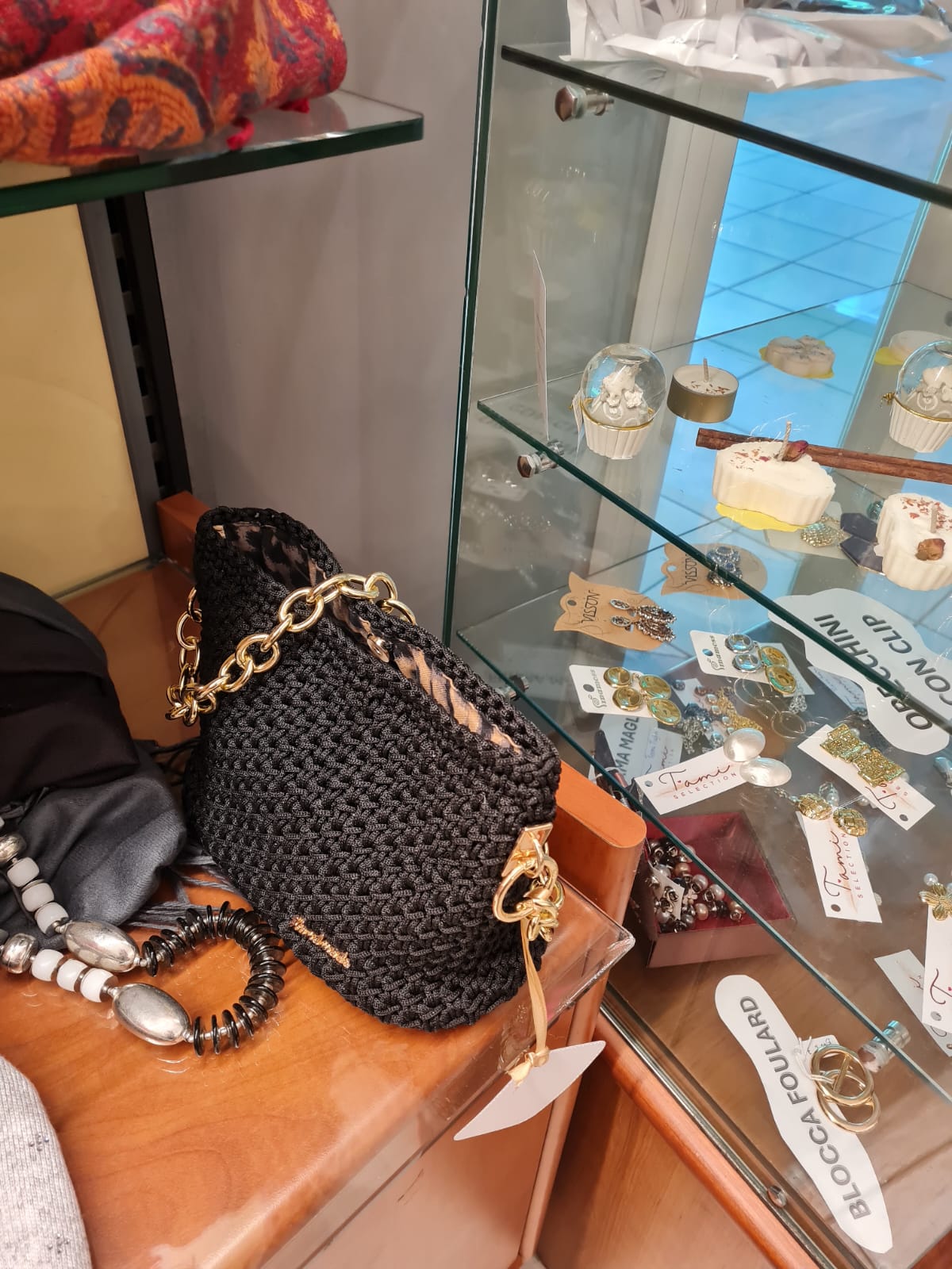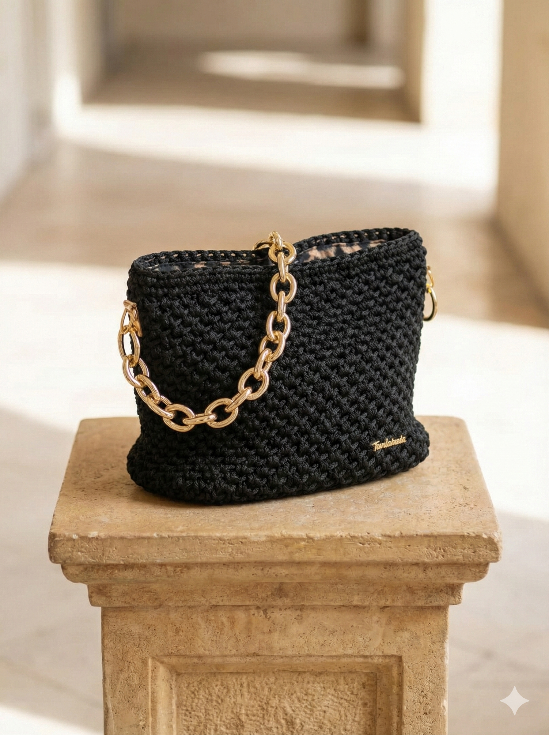 Design Tessuto: La borsa presenta una lavorazione a crochet di un elegante nero opaco, offrendo un aspetto strutturato e di tendenza.