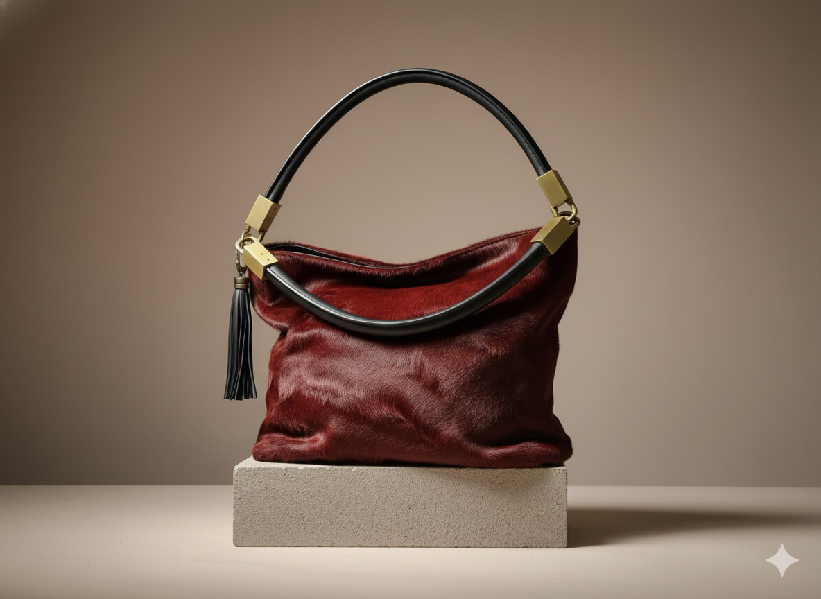 Lusso tattile e design contemporaneo. Questa borsa unisce la ricchezza della texture pony-hair in un’audace tonalità marsala con l’eleganza dei dettagli neri e metallici.