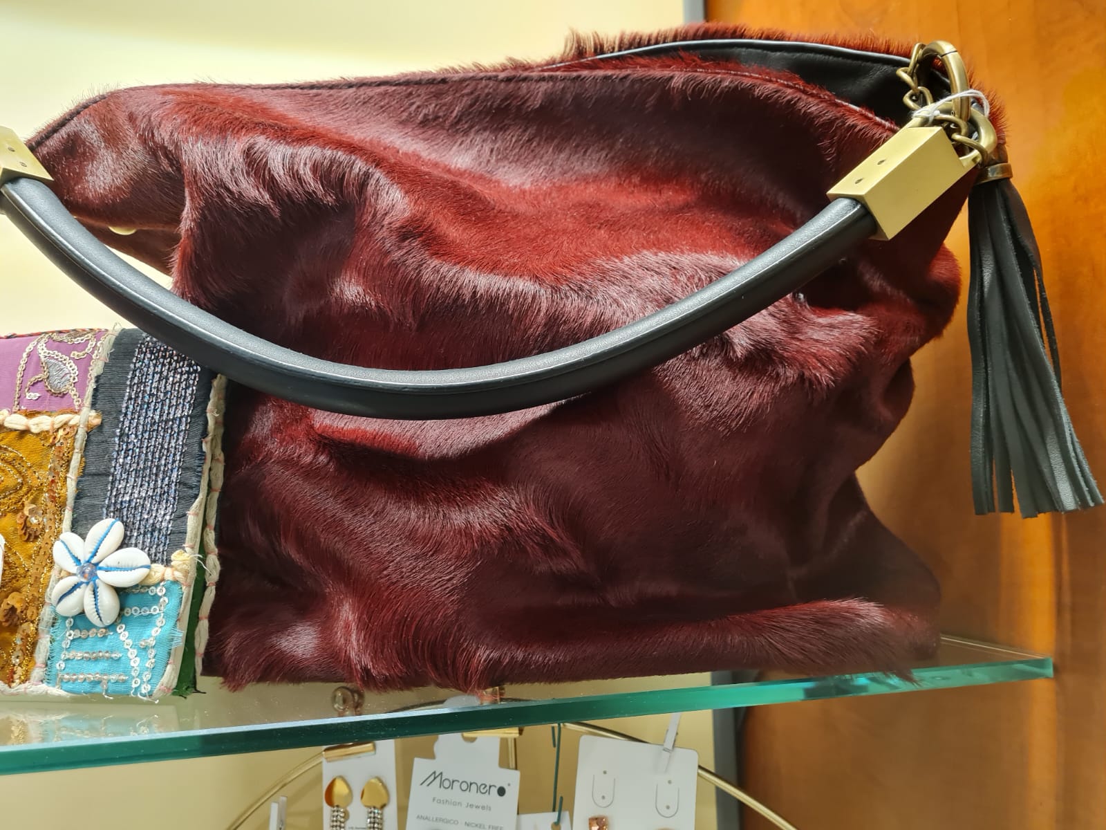 Texture Lussuosa: Il corpo della borsa è realizzato in simil-pelle o tessuto effetto pony-hair (pelo corto) in un profondo colore Rosso Scuro/Marsala/Bordeaux, che conferisce un aspetto caldo e sofisticato.