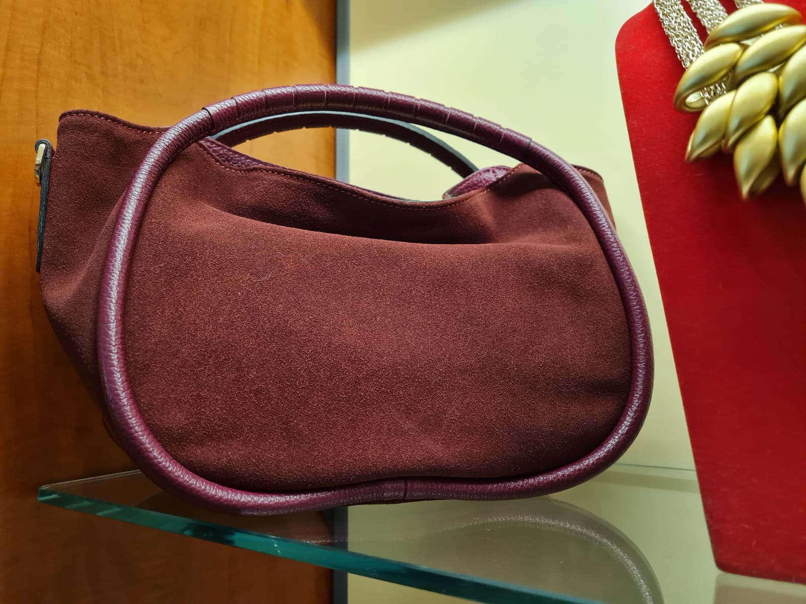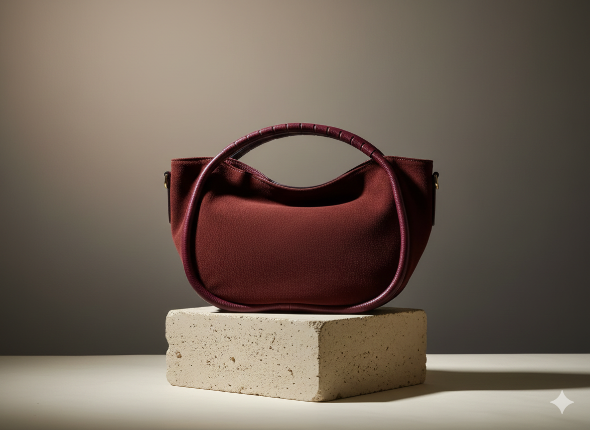 Dettagli Luminosi: La borsa è rifinita con una targhetta centrale, probabilmente con la dicitura “Handmade” (se non lo è, puoi sostituirla con il nome del tuo brand) e piccole nappe decorative bordeaux sui manici.