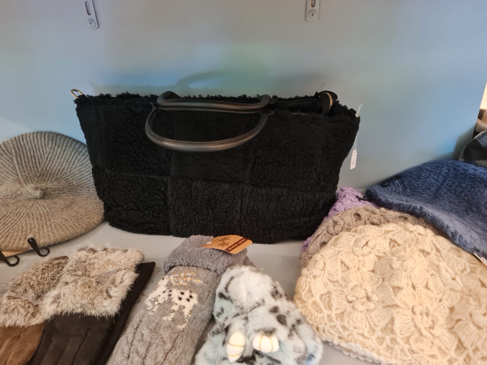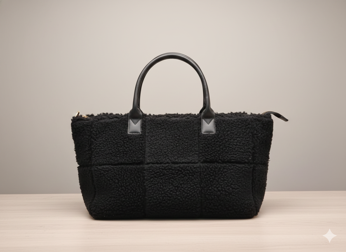 L’accessorio must-have per l’inverno. Questa borsa unisce la morbidezza del tessuto teddy (pelliccia sintetica) con la praticità di una tote bag, ideale per un look cozy e di tendenza.
