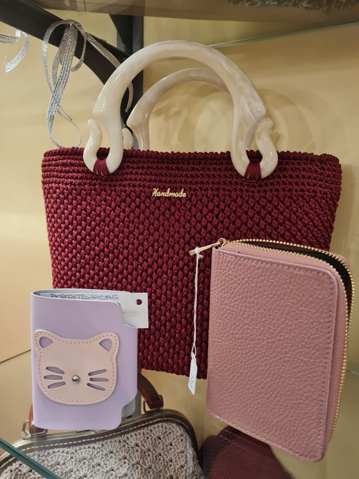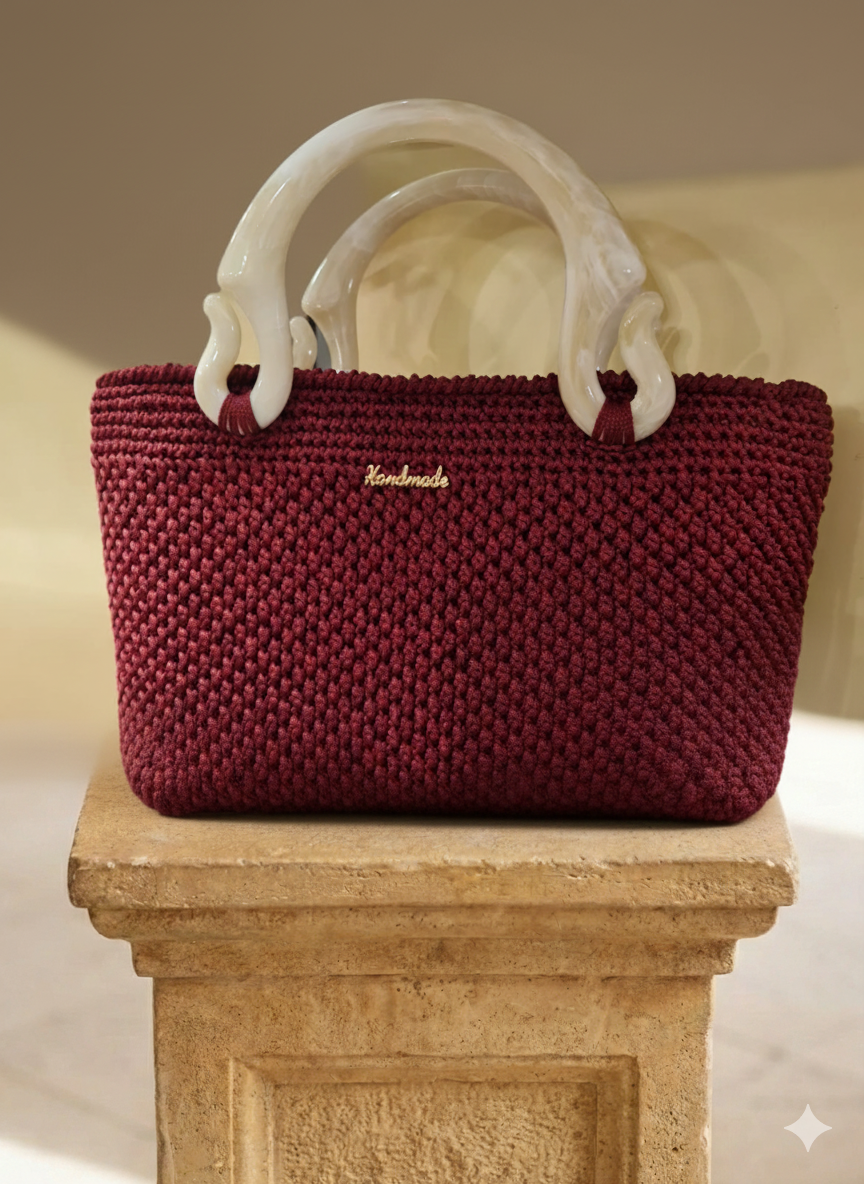 Colore e Texture: La borsa presenta una ricca tonalità Borgogna o Rosso Maraschino, realizzata con una fitta e strutturata lavorazione a maglia (crochet), che le conferisce corpo e resistenza.