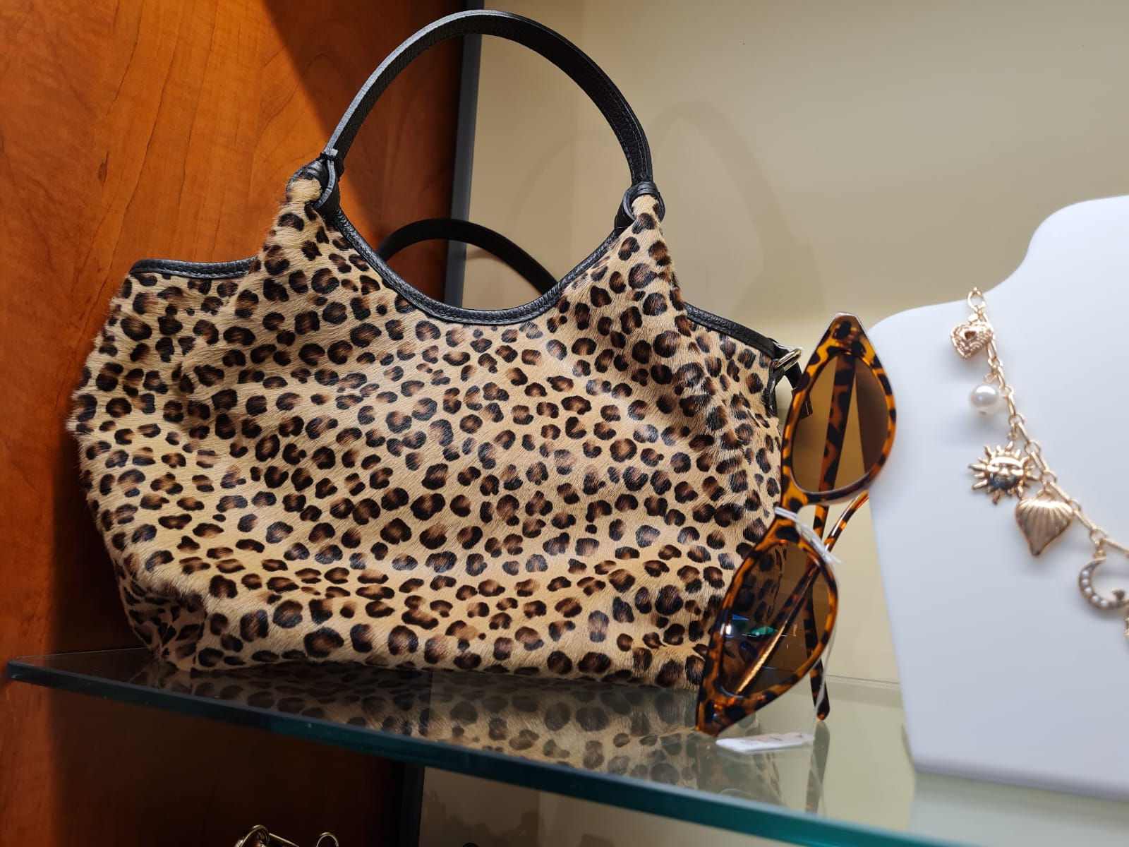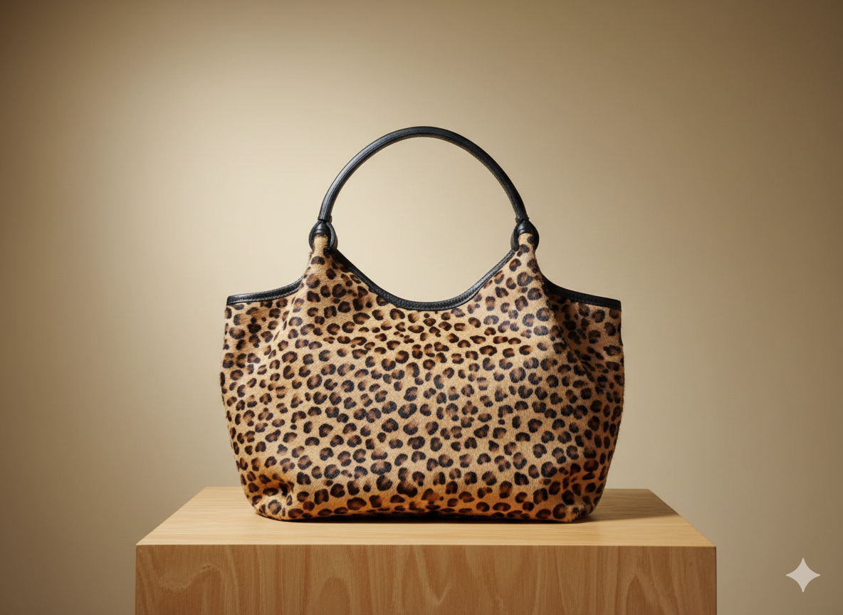 Stampa Iconica: Rivestimento in stampa leopardata (simil-pony hair o similpelle scamosciata) che offre una texture ricca e profonda, rendendo la borsa il punto focale di qualsiasi outfit.