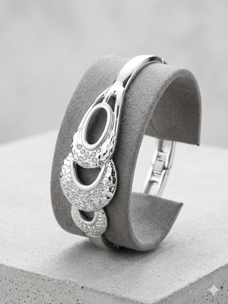 Il cuore del design è composto da tre elementi circolari degradanti, caratterizzati da una raffinata finitura martellata che crea un gioco di luci e ombre unico sulla superficie argentata. Ogni cerchio è impreziosito da un denso pavé di cristalli scintillanti, incastonati per massimizzare la brillantezza a ogni movimento. La struttura a fascia rigida, lucida e levigata, assicura una presenza importante ma raffinata, perfetta per completare un look da sera o per dare carattere a un outfit quotidiano.