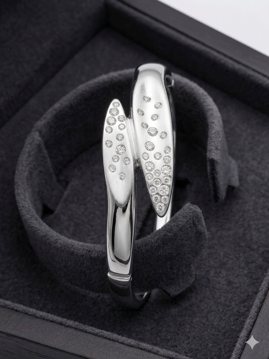 Il design centrale si ispira a linee naturali e sinuose, simili a foglie stilizzate che si incontrano in un abbraccio armonioso. Una parte del bracciale sfoggia una raffinata finitura satinata, che conferisce al metallo un aspetto setoso e contemporaneo, mentre l’altra estremità è interamente impreziosita da un vibrante pavé di cristalli scintillanti. Questo accostamento crea un dinamismo luminoso unico, capace di catturare la luce da ogni angolazione.