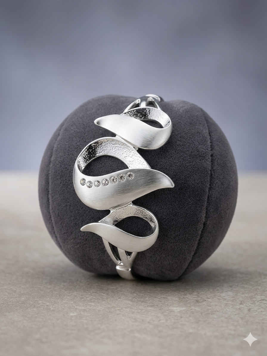 Design: Bracciale rigido con motivo a nastro sinuoso, doppia finitura (satinata/martellata) e pavé di cristalli.