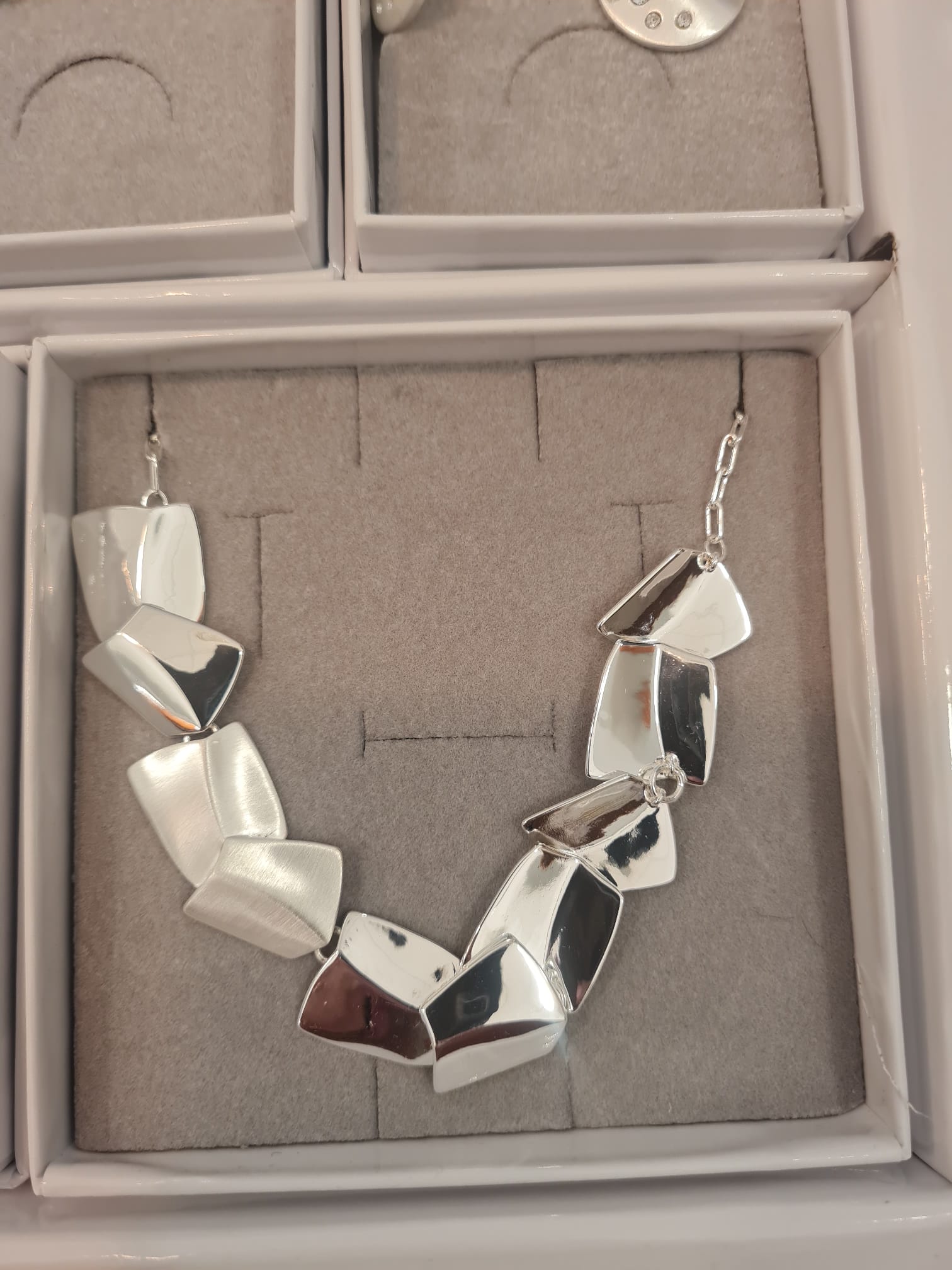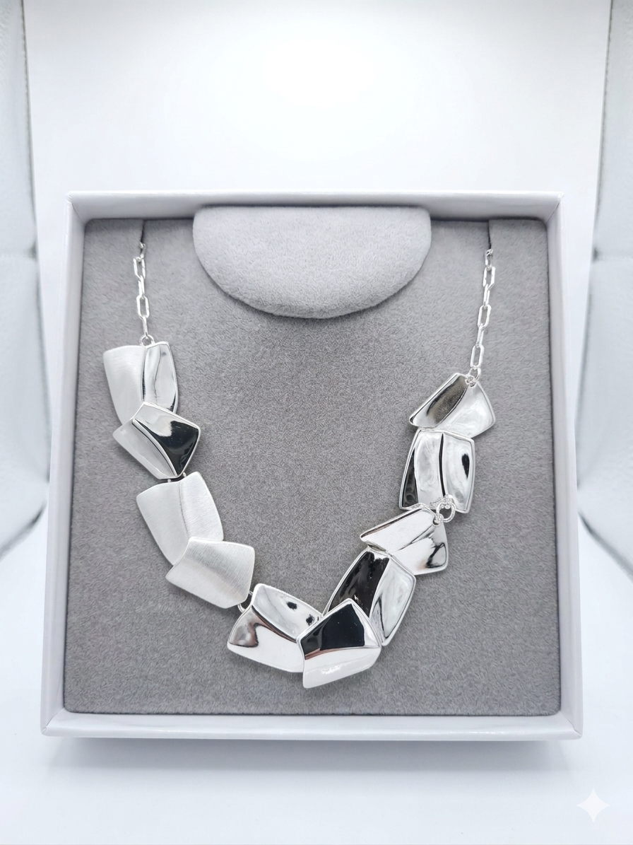 Esprime la tua personalità con questa collana Alex Arte, un pezzo dal design audace e profondamente moderno. La struttura è composta da una sequenza di elementi geometrici irregolari che creano un dinamismo fluido, riflettendo la luce in modo sempre diverso grazie alla loro disposizione sfalsata.