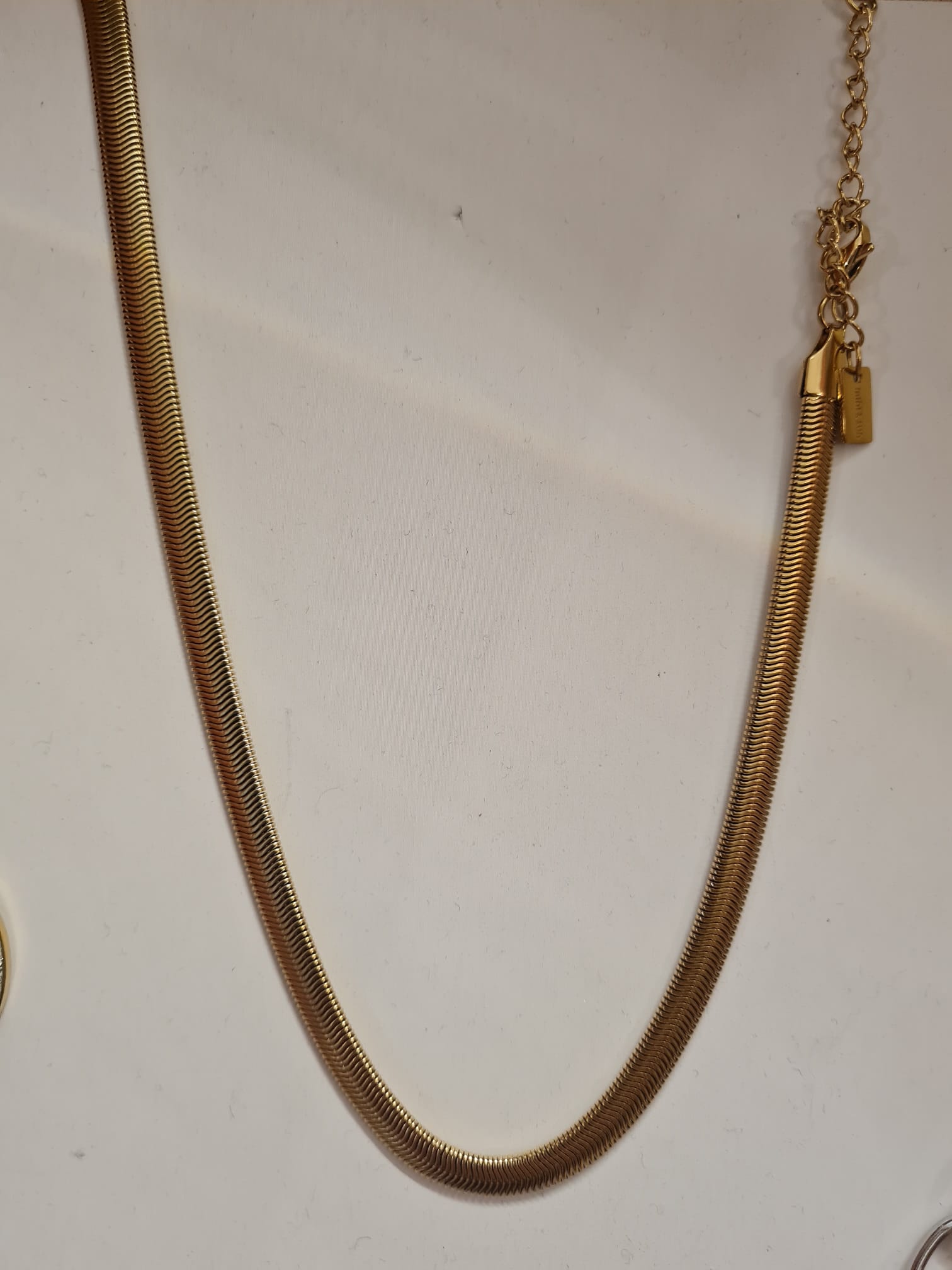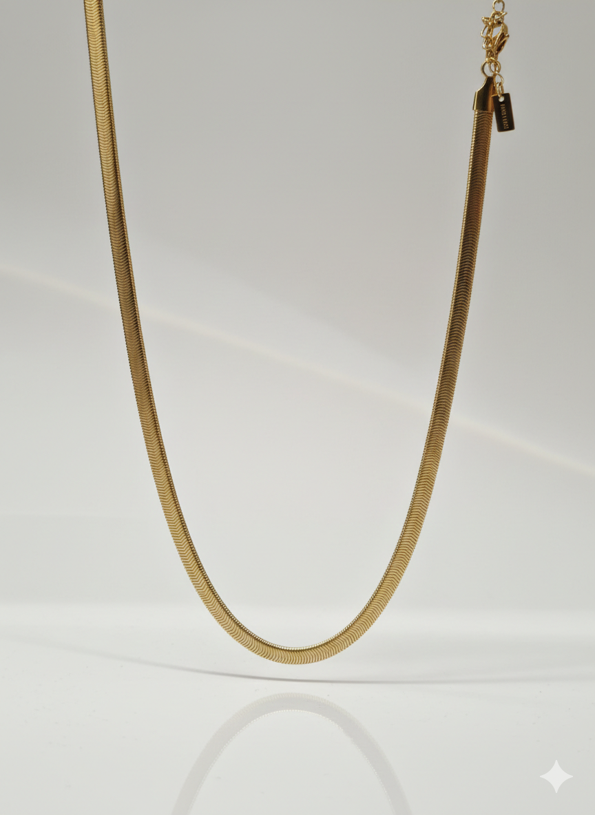 Questa collana si distingue per un design essenziale e moderno, caratterizzato da una maglia piatta e flessibile (modello snake o a lisca di pesce). La struttura è studiata per adagiarsi perfettamente sulla pelle, creando un effetto a nastro continuo che cattura la luce in modo uniforme grazie alla sua superficie levigata.
