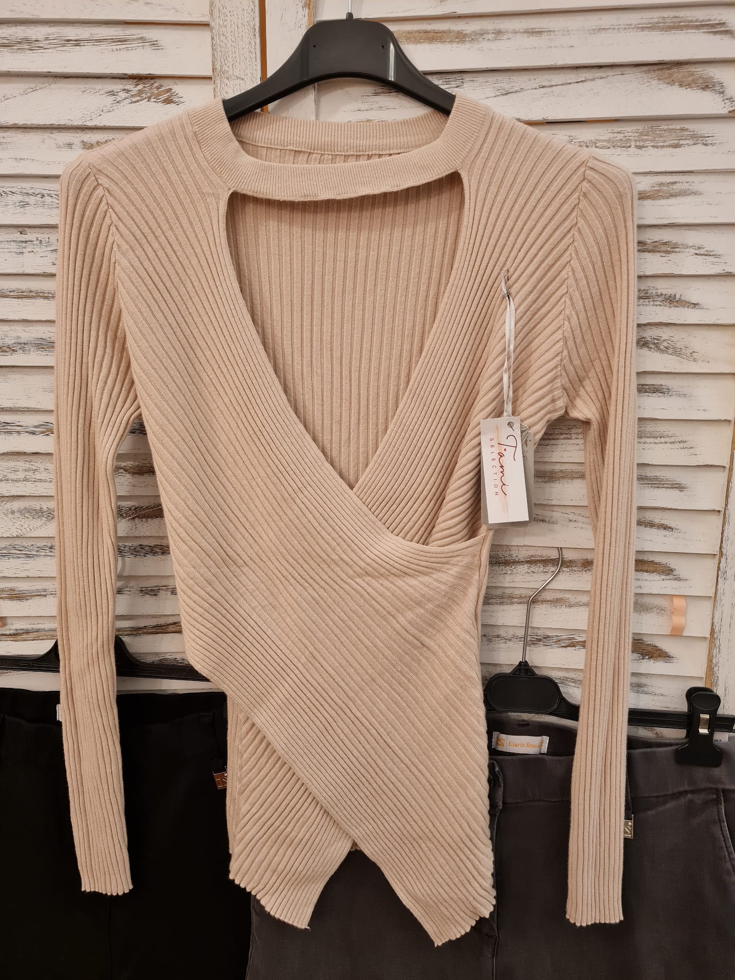 Questa maglia a costine nella delicata nuance beige sabbia è il capo perfetto per chi ama uno stile “quiet luxury”. Il punto di forza è l’originale scollo a V con incrocio frontale, che crea un gioco di volumi raffinato, arricchito dal dettaglio cut-out e dal choker coordinato che incornicia il viso con eleganza.