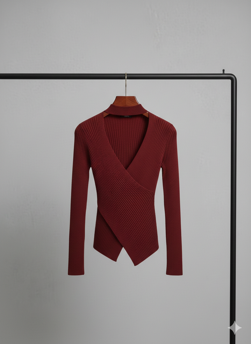 Questa maglia in tessuto a costine color bordeaux è il perfetto equilibrio tra eleganza e audacia. Caratterizzata da un particolare scollo a incrocio che valorizza il décolleté, presenta un raffinato dettaglio cut-out con choker integrato, ideale per chi cerca un look ricercato senza rinunciare al comfort.