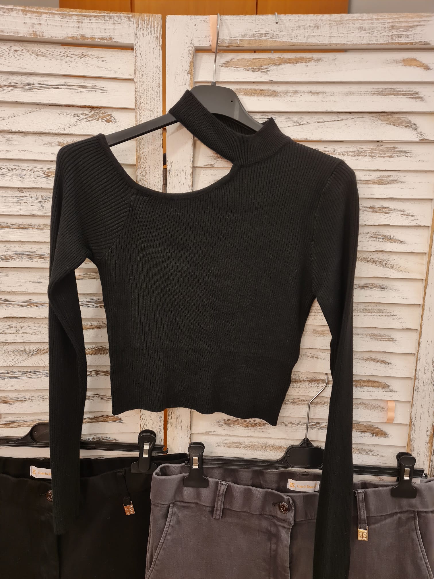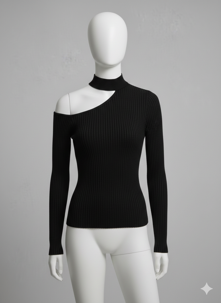 Questa maglia nera in tessuto a costine è il capo ideale per chi cerca uno stile minimalista ma di grande impatto. Il design si distingue per il taglio monospalla asimmetrico e l’elegante dettaglio cut-out sulla spalla opposta, completato da un raffinato colletto tipo choker integrato.