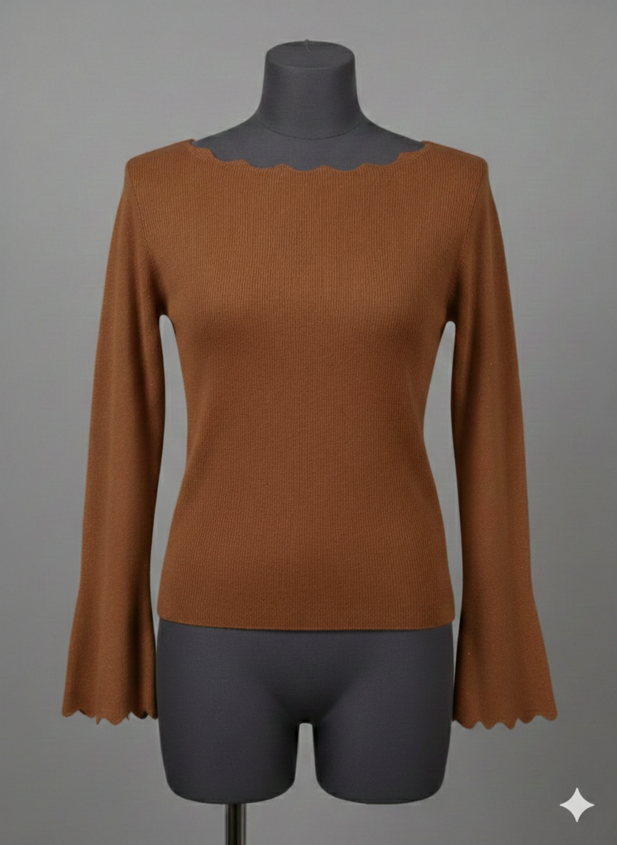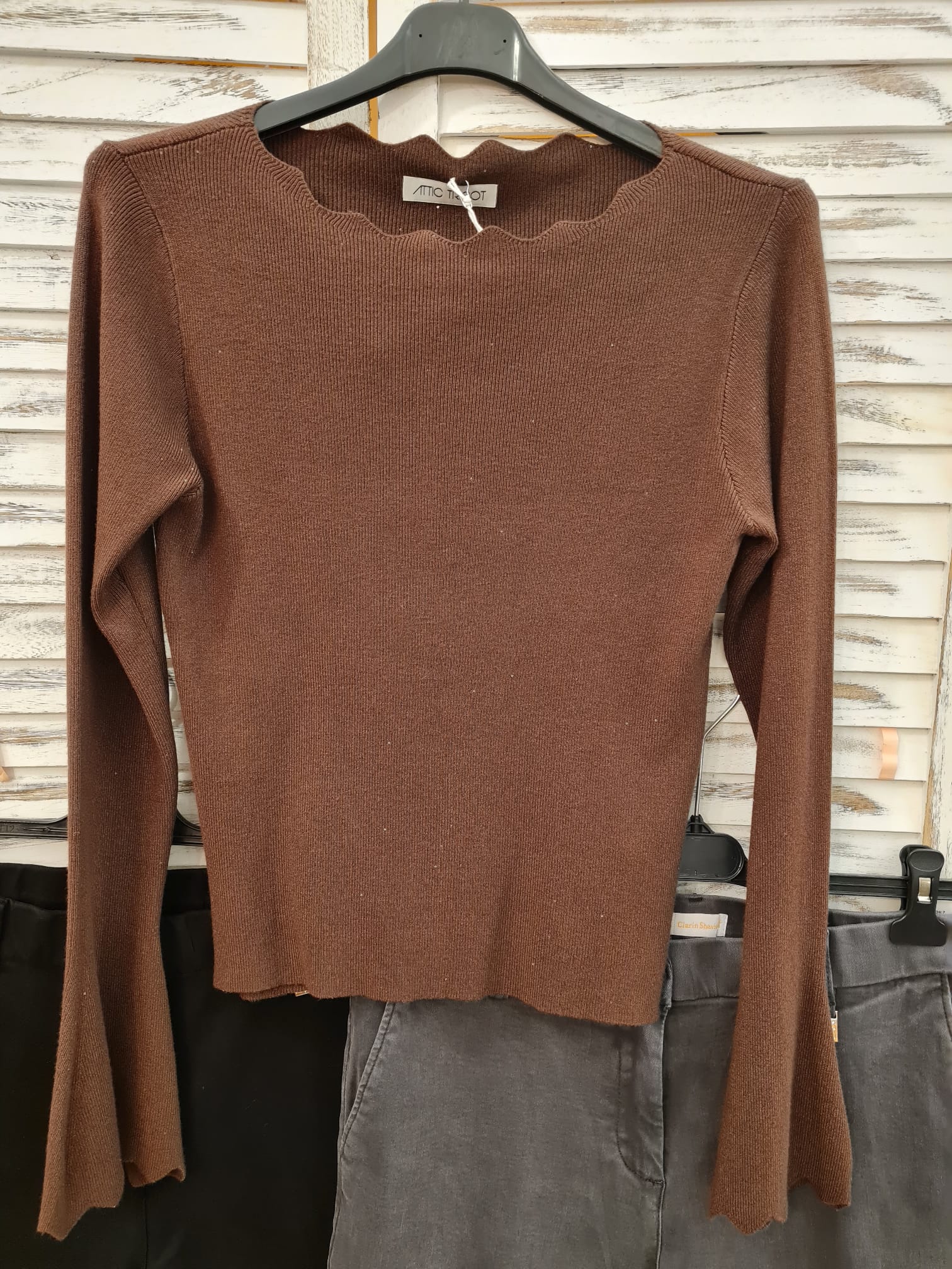 Questa maglia firmata Attic and Barn reinterpreta un classico della maglieria femminile attraverso una sofisticata tonalità marrone cioccolato. Il capo si distingue per il raffinato scollo a barchetta rifinito con un delicato bordo a festone (ondulato), che aggiunge un tocco romantico e bon-ton alla silhouette.