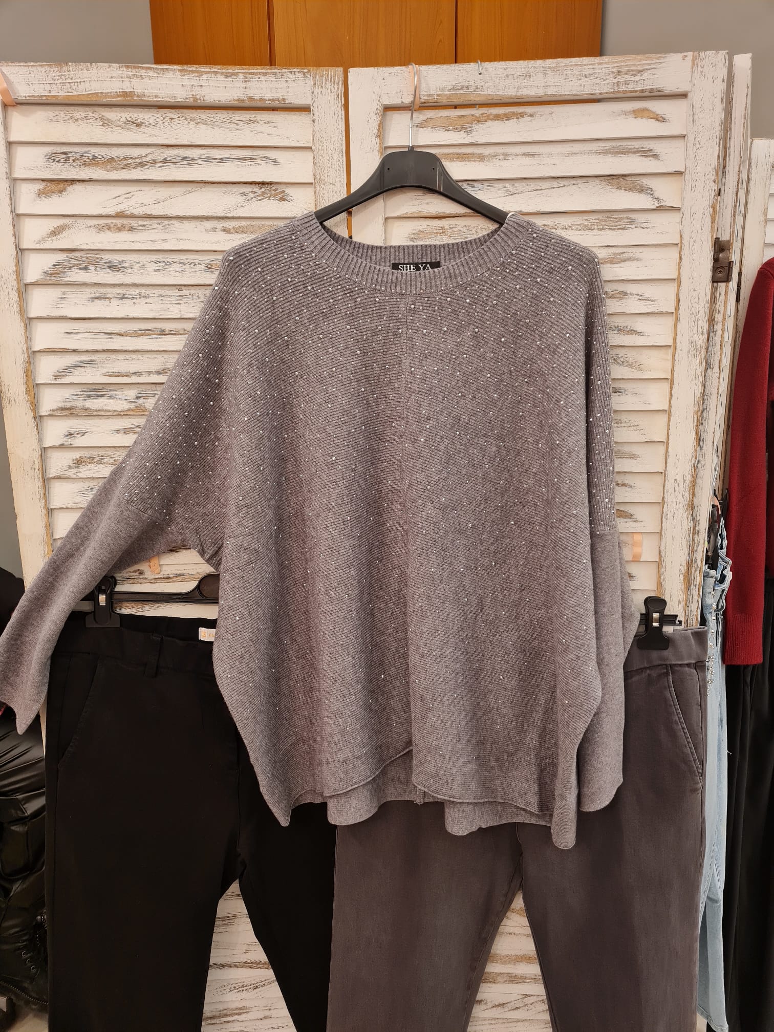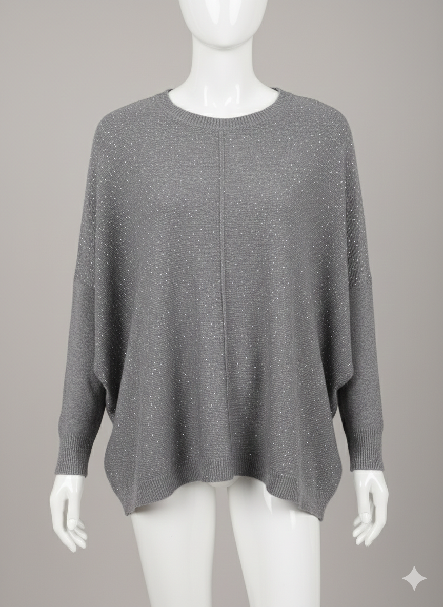 Questa maxi maglia è il perfetto equilibrio tra uno stile casual e un tocco di luce sofisticata. Realizzata in una morbida tonalità grigio mélange, è interamente impreziosita da una pioggia di micro-strass applicati sul davanti, che catturano la luce regalando un effetto brillante ma discreto.