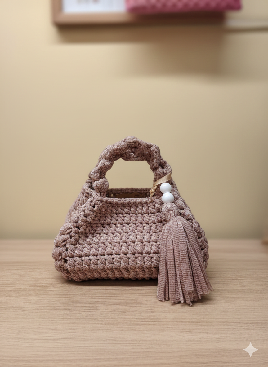 Texture e Colore: Realizzata con una fitta lavorazione a maglia (crochet) in una morbida tonalità rosa antico o malva chiaro, molto versatile e di tendenza.