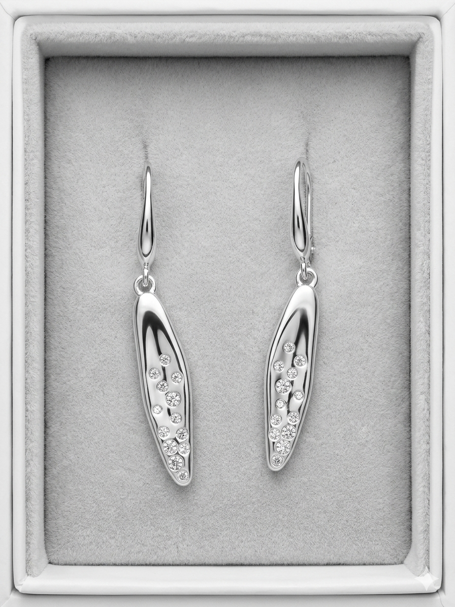 Parte dell’esclusiva linea Scintille, questi orecchini rappresentano il perfetto equilibrio tra modernità e femminilità. La silhouette sottile e affusolata slancia il profilo, mentre la disposizione asimmetrica dei cristalli sulla superficie placcata argento richiama la lucentezza di una costellazione, rendendo ogni pezzo un piccolo capolavoro di design.