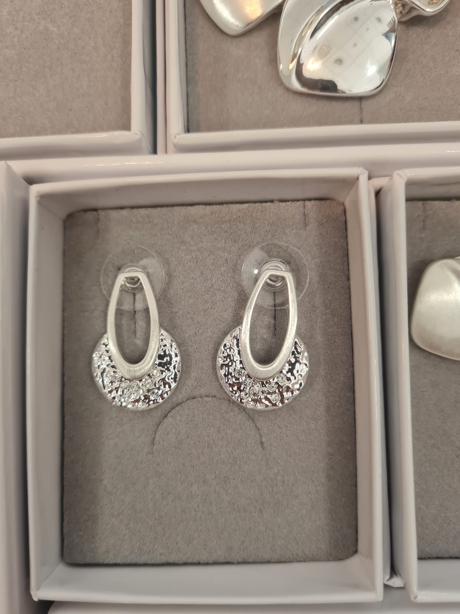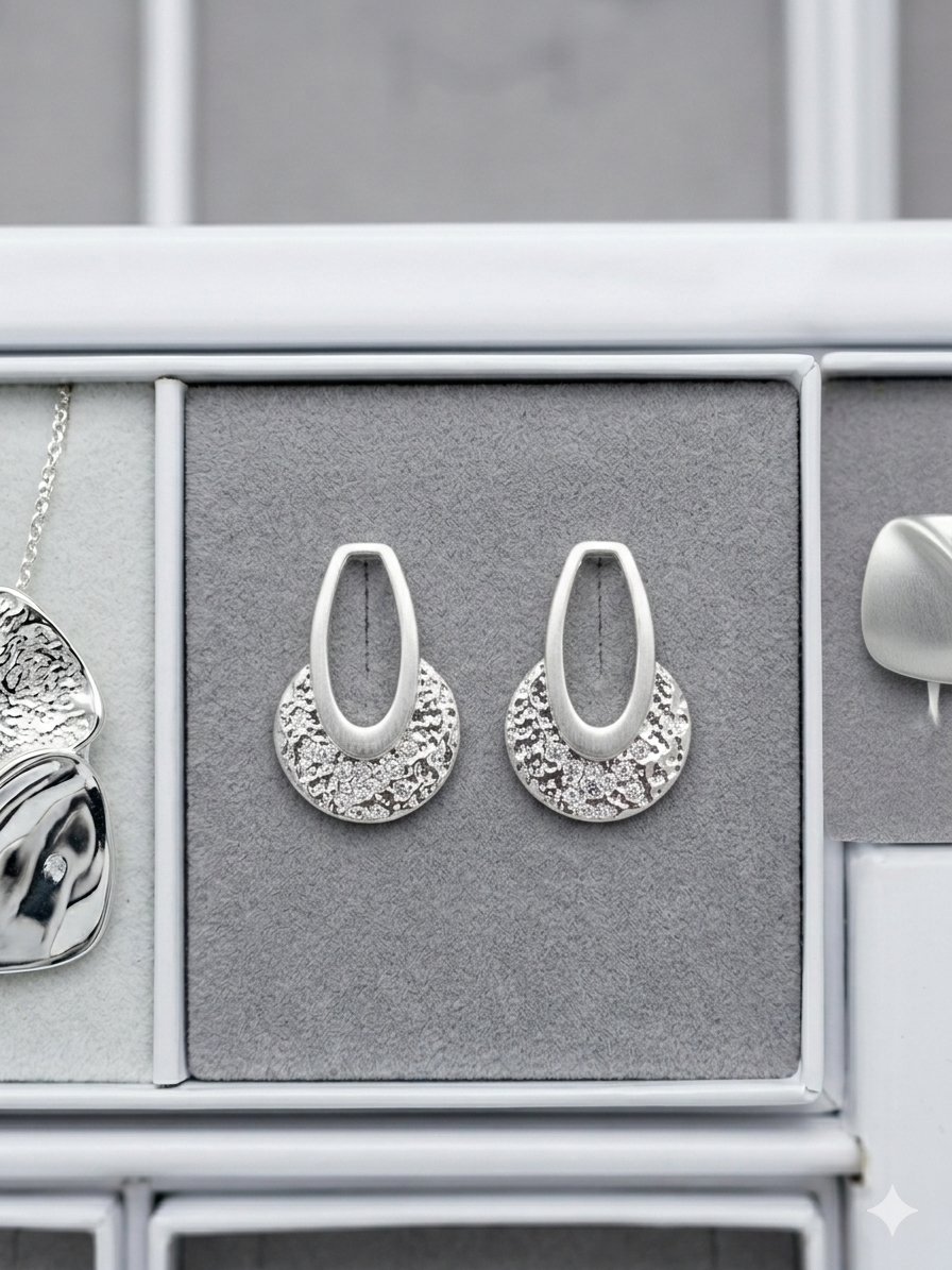 Questi orecchini della linea Scintille giocano con i contrasti per creare un accessorio dal forte impatto visivo. La parte superiore, un ovale allungato dalla finitura satinata, sostiene un elemento circolare arricchito da una texture lavorata che incastona numerosi cristalli, progettati per riflettere la luce a ogni movimento del capo.