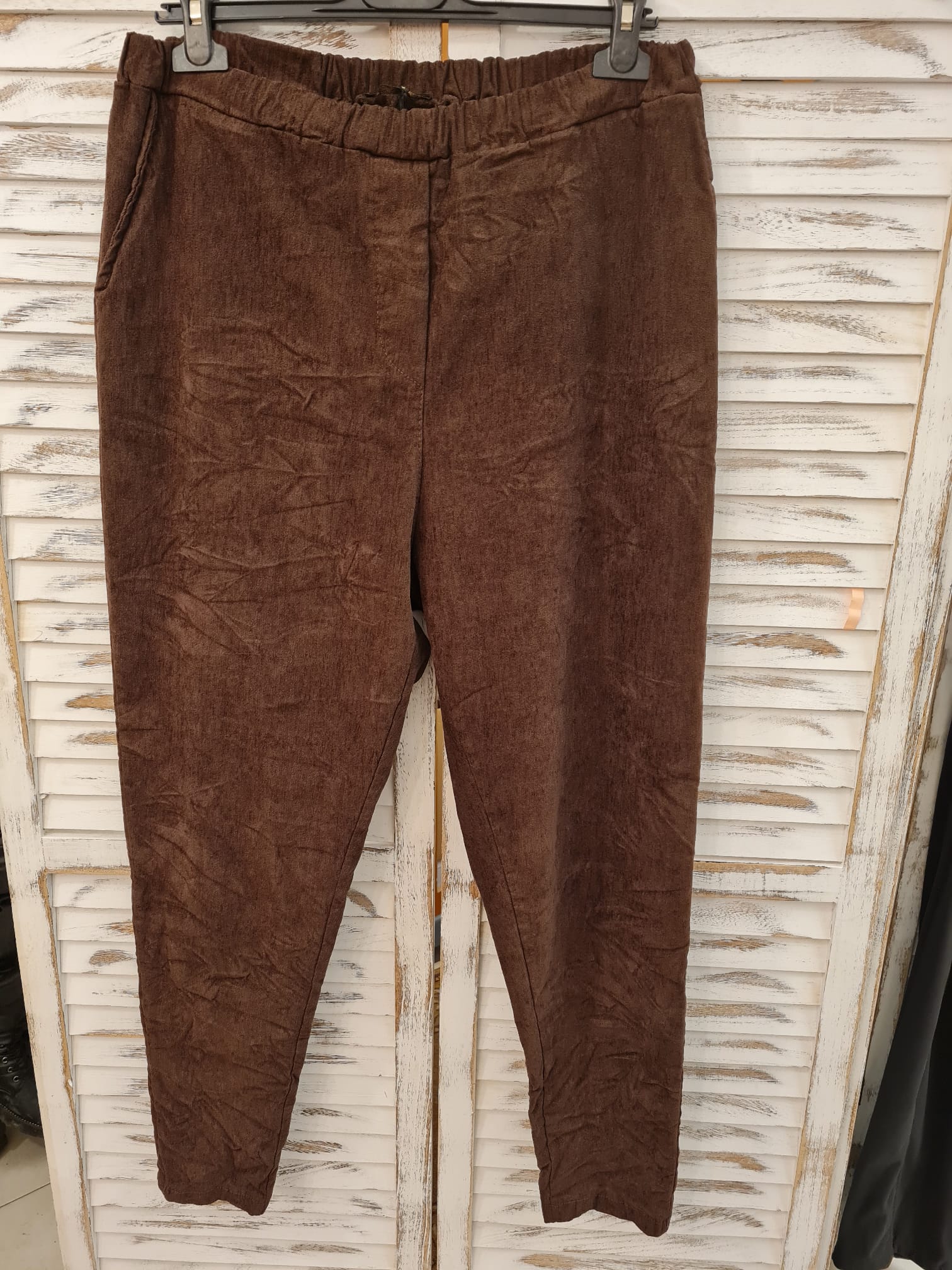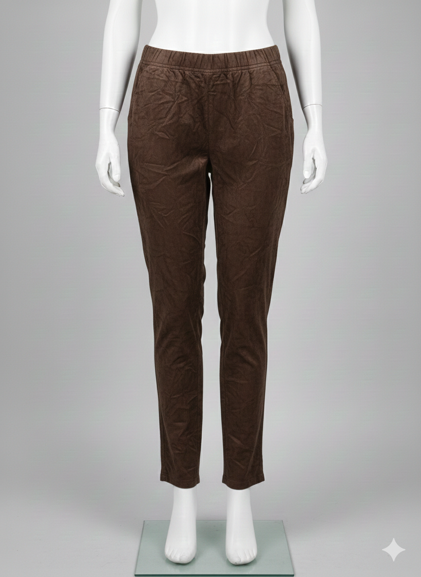 Questo pantalone si distingue per la sua particolare texture effetto suede (scamosciato), che regala una sensazione di estrema morbidezza al tatto e un aspetto sofisticato. La tonalità marrone caffè è calda e profonda, perfetta per creare abbinamenti eleganti con i toni del panna, del beige o del nero.