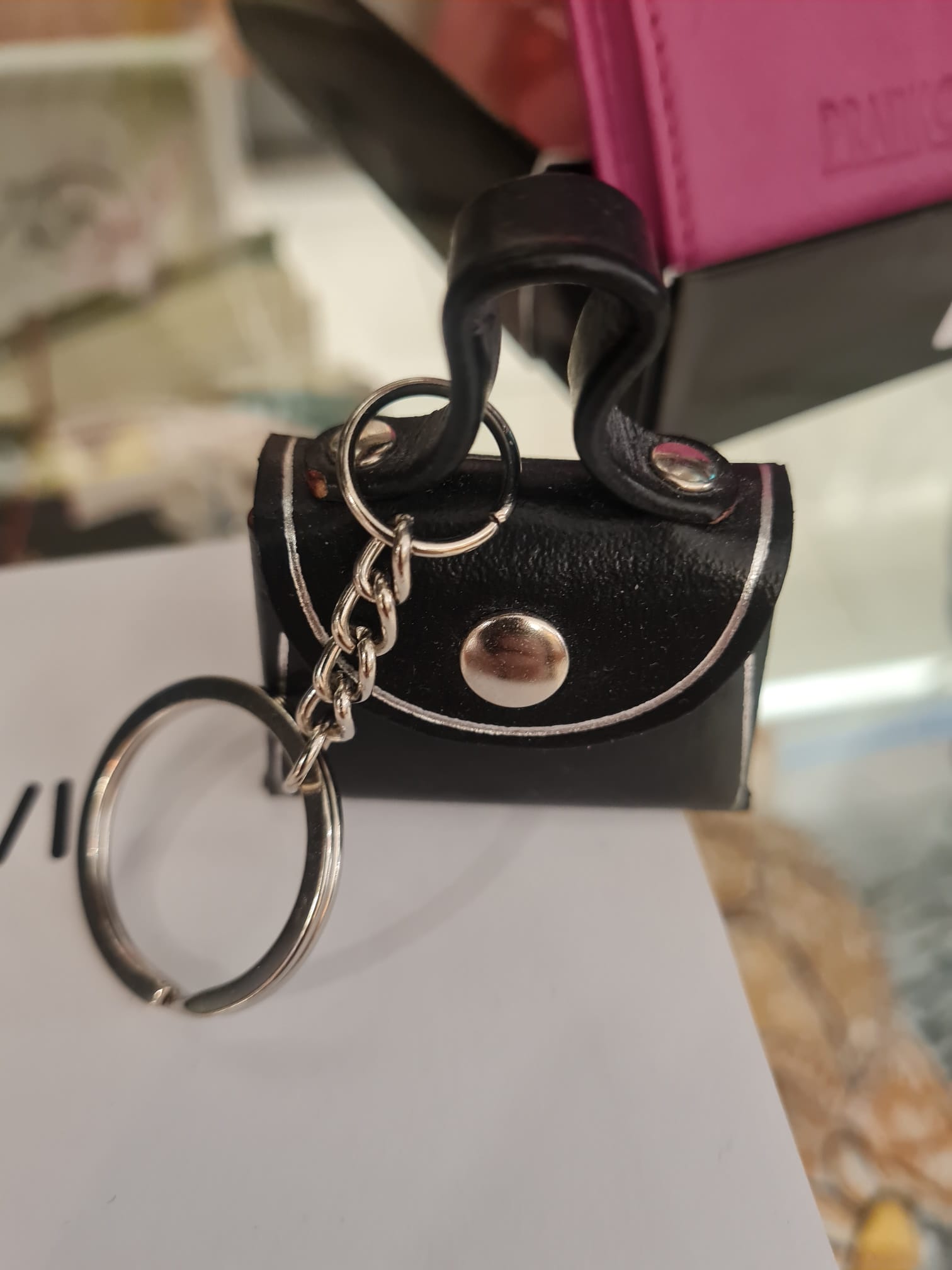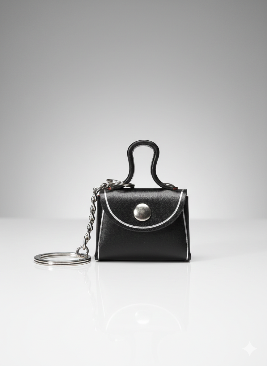La patta frontale a semicerchio è profilata da una sottile linea argentata e si chiude con un bottone metallico centrale in finitura silver. Il design è completato da un manico superiore rigido e sagomato. L’accessorio è collegato a un anello brisè in metallo tramite una catenella a maglie ritorte, ideale per agganciare le chiavi o per essere utilizzato come charm da borsa.