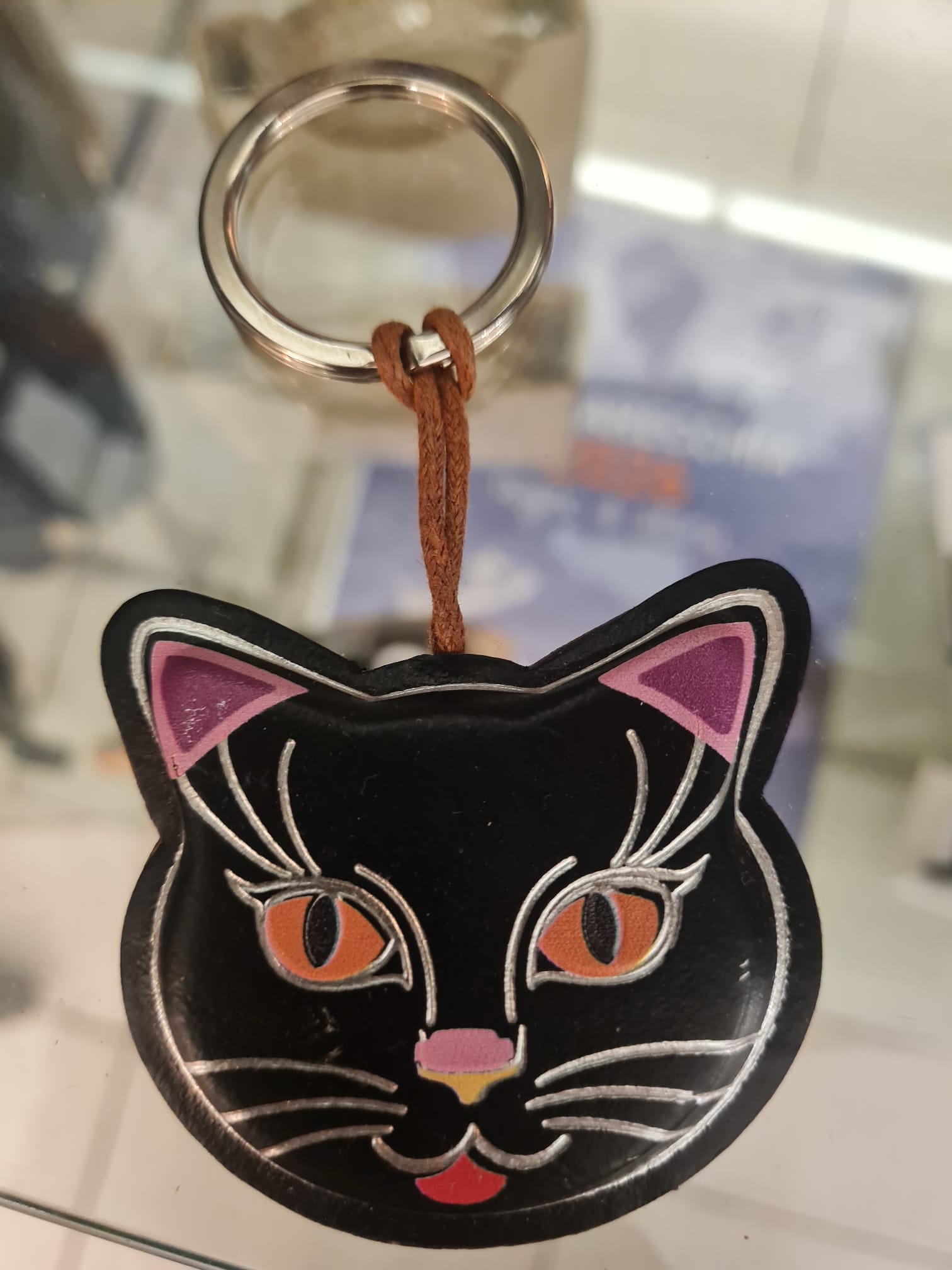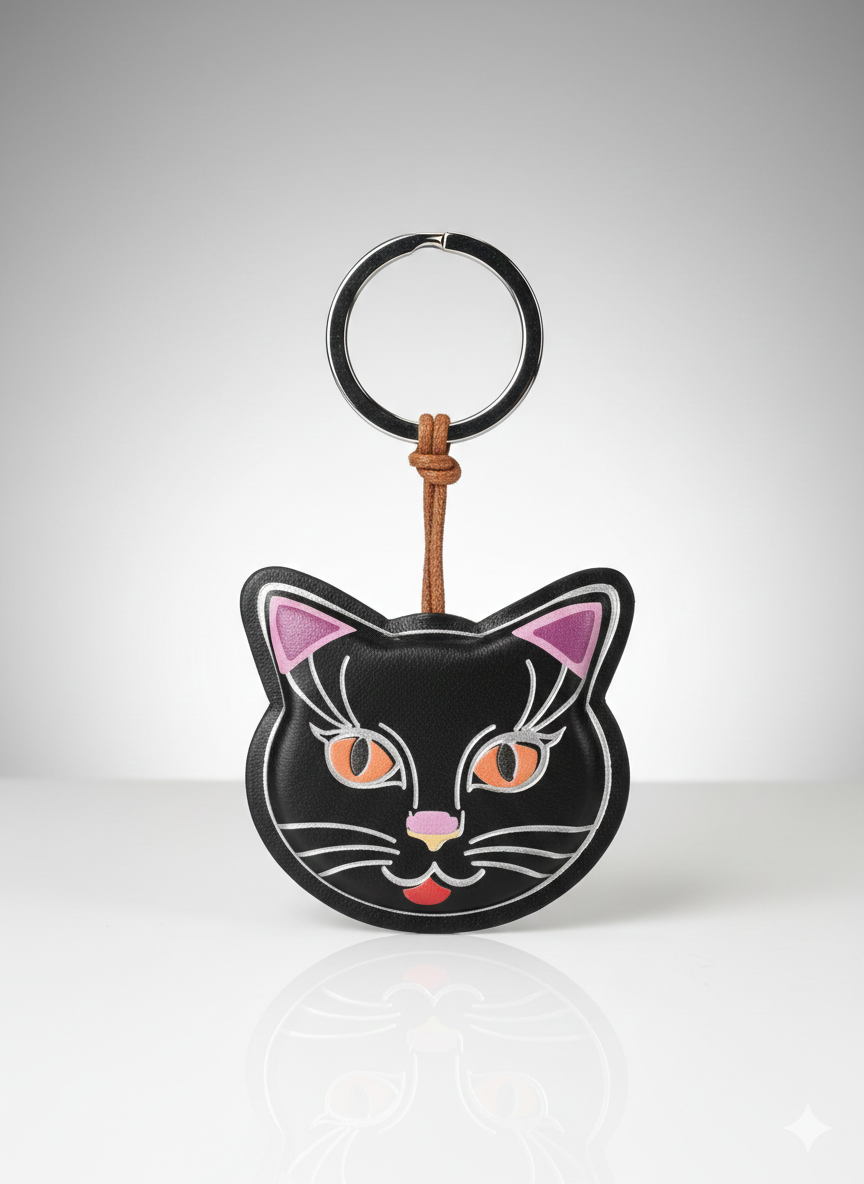 Il muso è impreziosito da inserti e stampe che ne definiscono i lineamenti: le orecchie presentano un interno viola/fucsia, mentre gli occhi grandi e magnetici sono di un colore arancione acceso. Sottili linee argentate delineano i baffi, le ciglia e il contorno del volto, completando il design con un nasino rosa e una linguetta rossa stilizzata. Il portachiavi è agganciato a un anello metallico brisè attraverso un laccetto in cuoio marrone con chiusura a nodo.