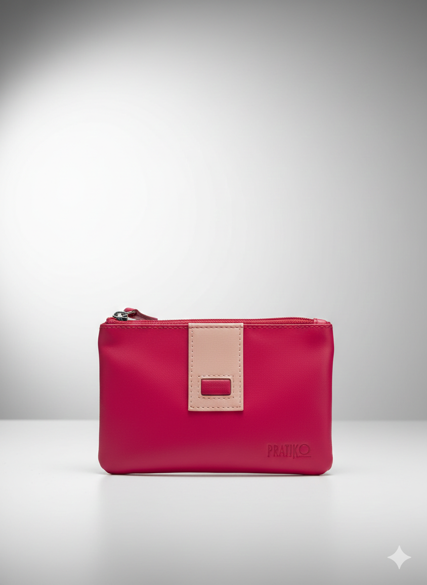 Questo accessorio del brand Pratiko si presenta come una bustina multifunzione dal profilo piatto e compatto. Il corpo principale è realizzato in un colore fucsia vivace, caratterizzato da una superficie liscia e opaca.