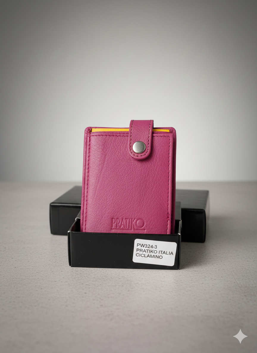 Realizzato in vera pelle di altissima qualità, questo mini-portafoglio sfoggia una magnifica e intensa tonalità Ciclamino (Magenta/Fucsia), pensata per chi non vuole rinunciare allo stile anche negli accessori più piccoli.