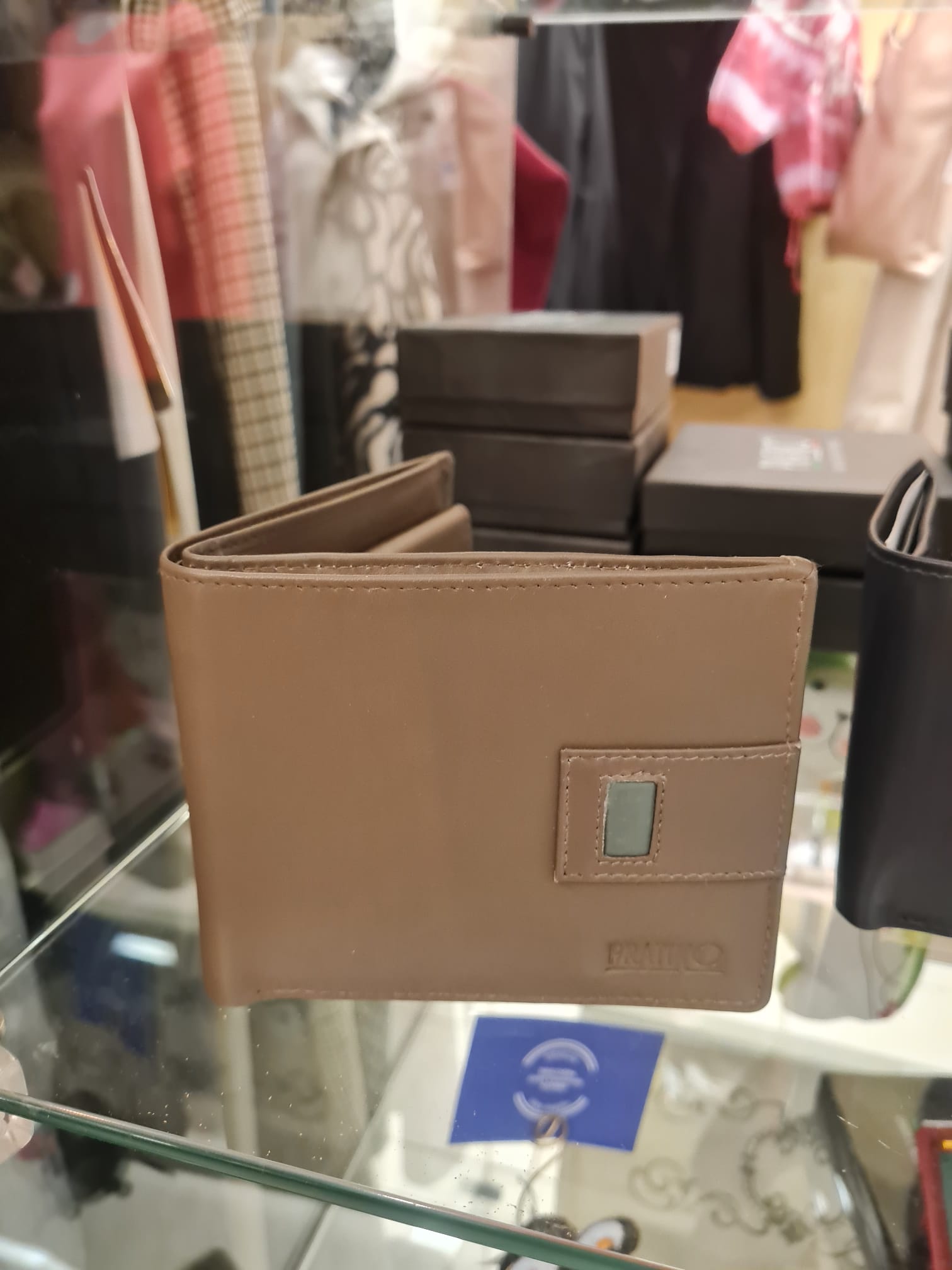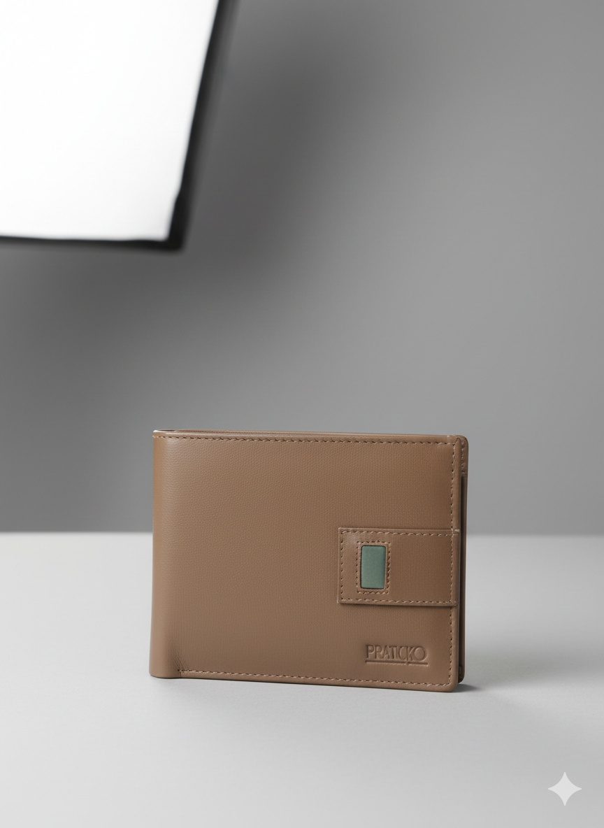 Questo portafogli del brand Pratiko presenta un design classico a due ante (bi-fold) in una tonalità marrone medio. La superficie esterna è caratterizzata da una grana sottile e regolare, completata dal logo del marchio impresso a rilievo nell’angolo inferiore destro.