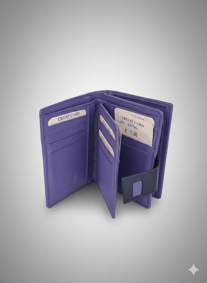 Questo portafogli del brand Pratiko presenta una struttura interna articolata in tre sezioni apribili a libro. Il design è caratterizzato da una colorazione viola intensa con inserti e linguetta di chiusura a contrasto in blu scuro.