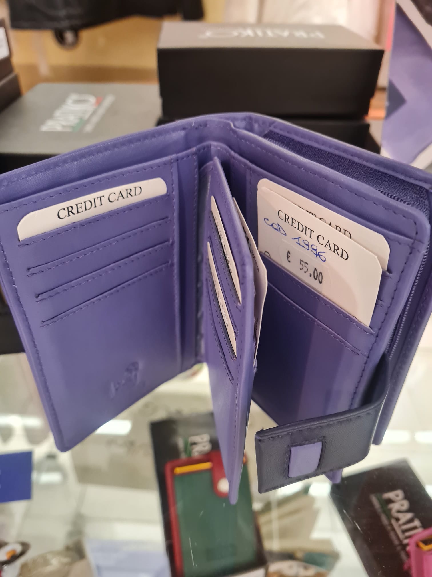 L’organizzazione interna è progettata per contenere diverse tessere grazie ai numerosi slot orizzontali e verticali posizionati su ogni anta. È presente un divisorio centrale mobile che aggiunge ulteriori spazi per l’inserimento di documenti o carte di credito. Una linguetta esterna con inserto rettangolare funge da sistema di chiusura per mantenere compatto l’accessorio.